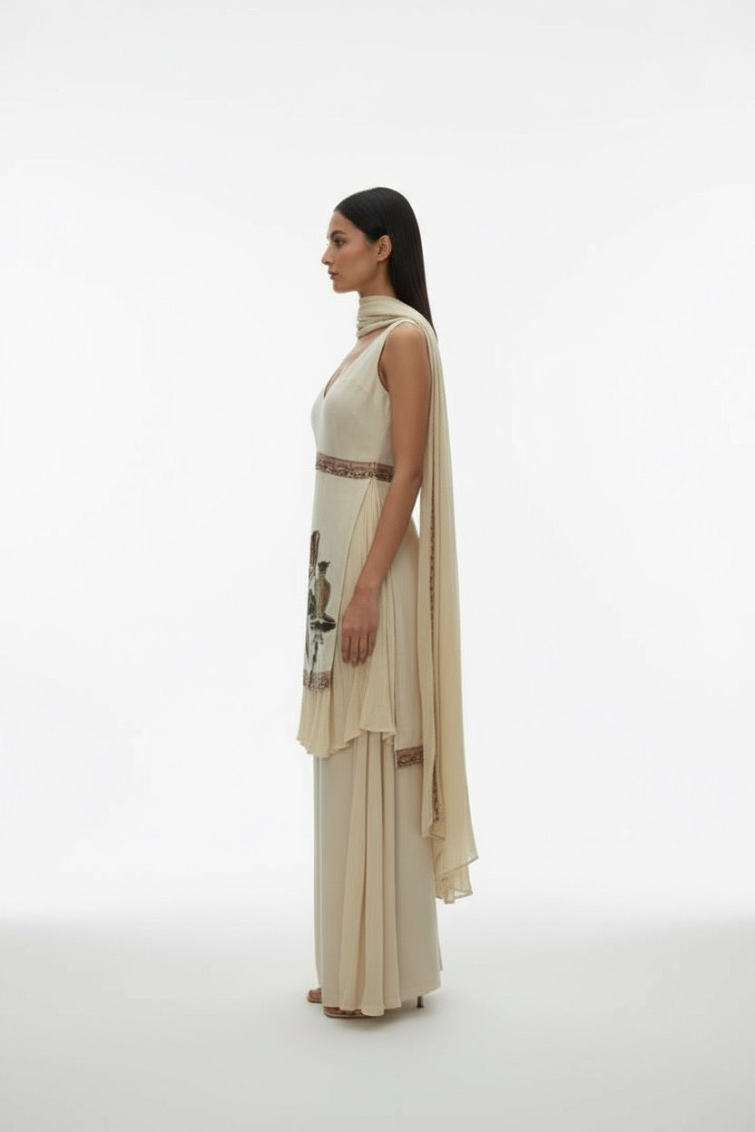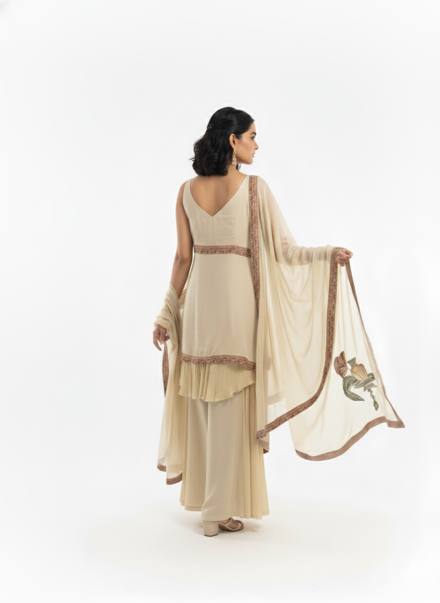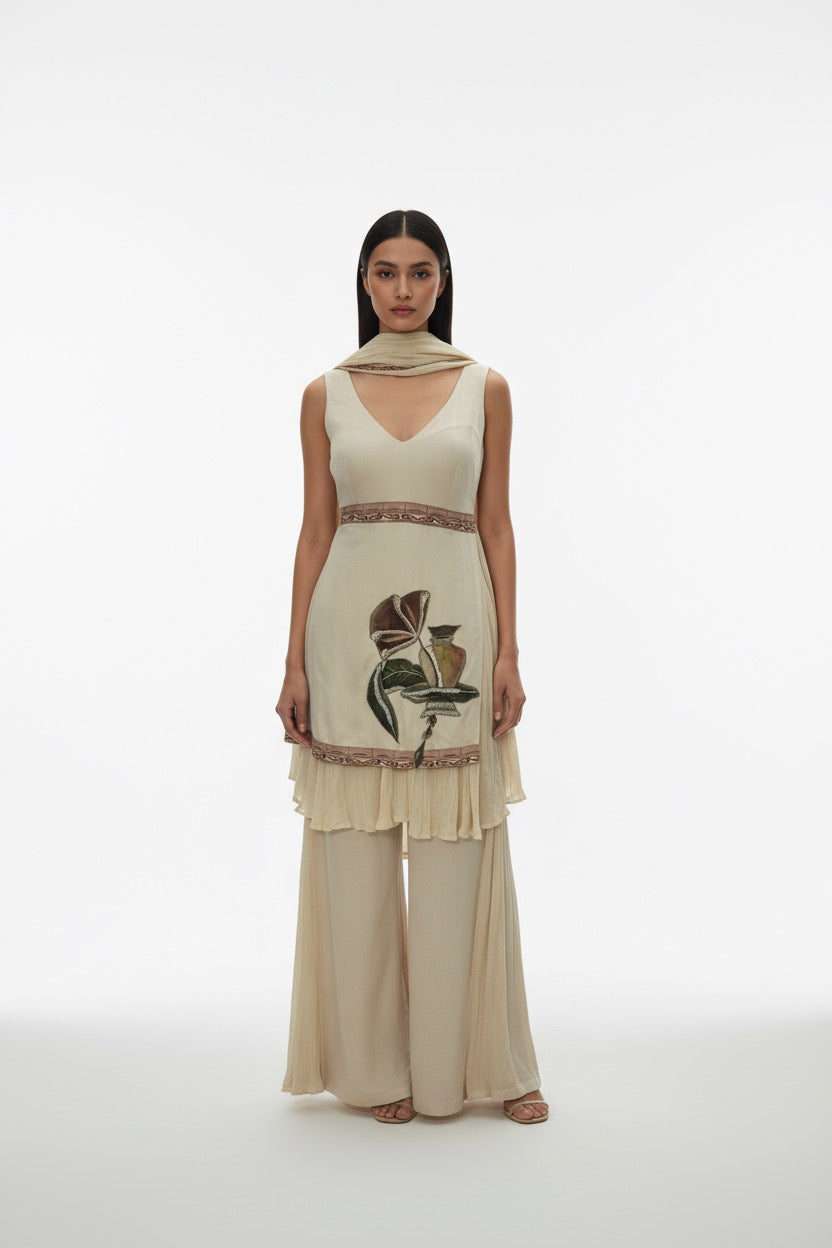 Discover our elegant Ivory Sharara Set, the definition of Contemporary Ethnic Wear. This Designer Kurta Sharara features a sophisticated sleeveless kurta with a unique, artistic hand-embroidered tunic panel. The luxurious silk blend fabric and graceful layered sharara pants make this the perfect Festive Indian Outfit. Shop this modern, minimalist set for weddings and celebrations!
