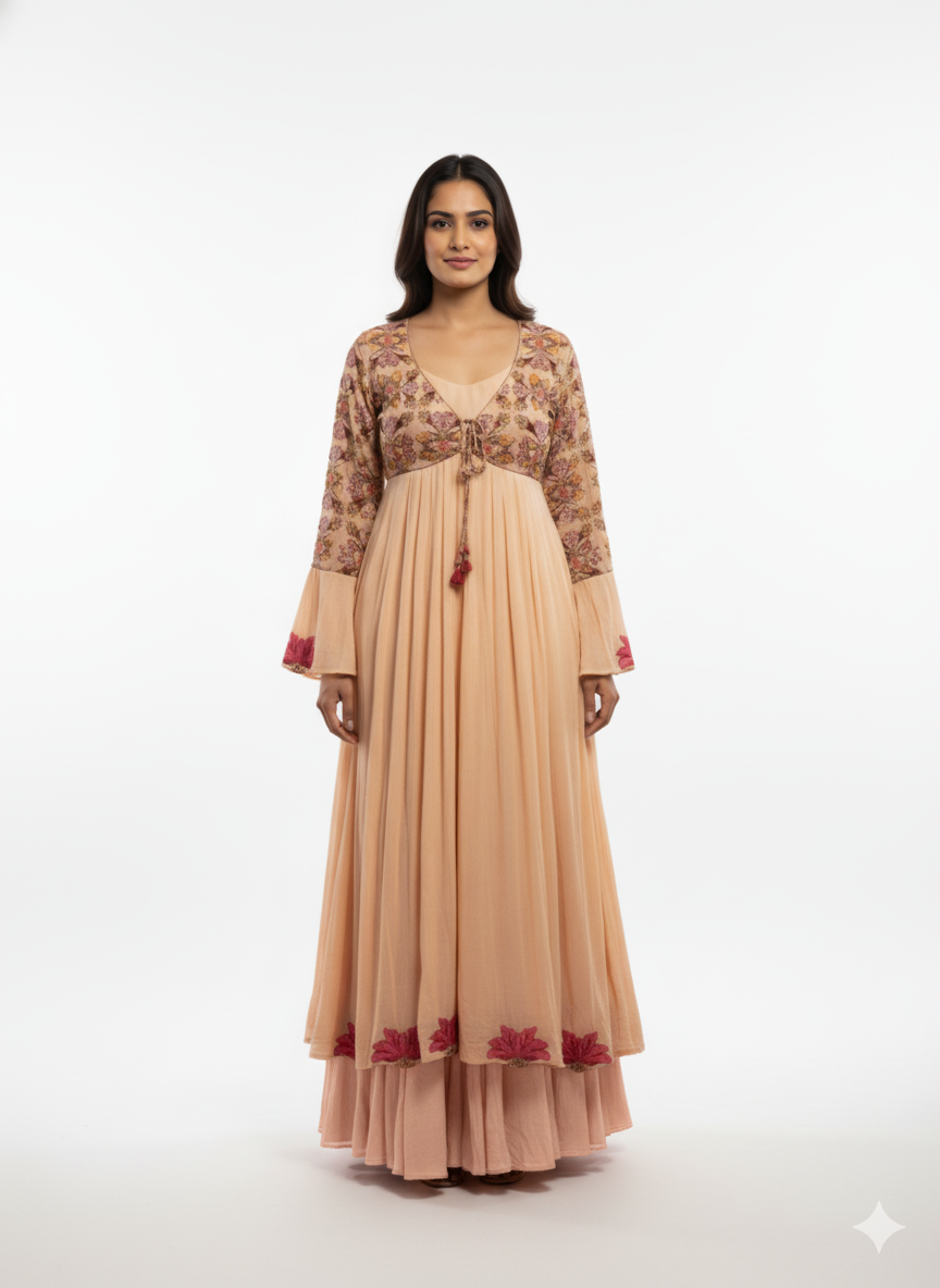 Introducing the ultimate Designer Ethnic Wear: a breathtaking Peach Anarkali Gown and matching Embroidered Jacket Set. Crafted from premium Cotton , this full-length Anarkali features exquisite floral hand embroidery and modern Bell Sleeves. Perfect as a high-fashion Wedding Guest Dress or your go-to Festive Outfit. Experience the elegance of this timeless Traditional Indian Dress.