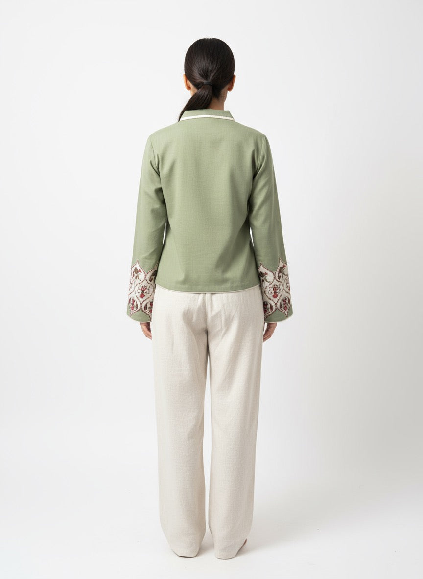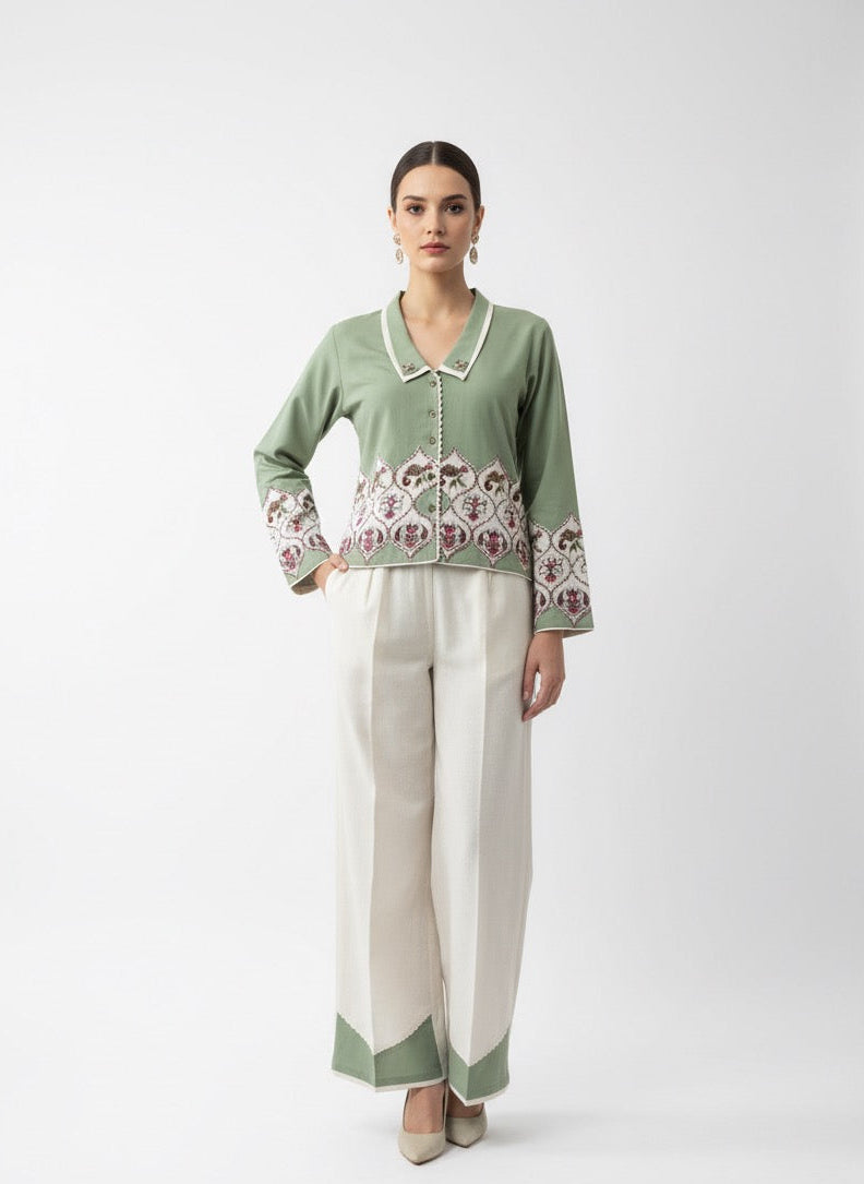 This dress is a trendy indo-western co-ord set featuring a green and white embroidered jacket top paired with wide-legged cream pants. designed for women seeking. stylish ethnic wear, it blends modern comfort with traditional Indian motifs, making it ideal for festive occasions, parties, or casual outings. perfect for those searching online for "designer co-ord sets for women," "indo-western fusion outfits," or "contemporary ethnic wear," this ensemble is easy to style, elegant, and suitable for all seasons, providing a fashionable statement with minimal effort.