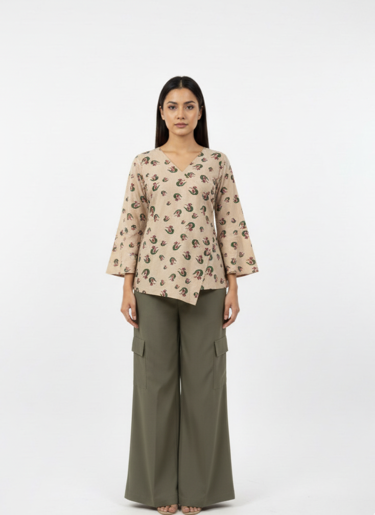 Upgrade your style with Orgavastr’s sustainable kurta set, featuring a beige printed tunic and olive green wide-leg cargo pants. This eco-friendly women’s outfit is crafted from organic, breathable fabrics and showcases timeless Amer fort -inspired prints, blending tradition with modern comfort. The relaxed-fit kurta has a flattering V-neckline and elegant flare sleeves, promoting mobility and airiness for all-day wear.