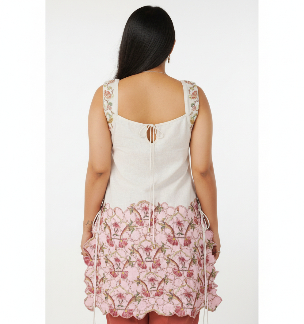 Refresh your closet with this stylish Summer Ethnic Wear set. Featuring a chic White Tunic with delicate shoulder hand embroidery and a vibrant pink floral print and embroidery hem. The contemporary sleeveless kurta design is perfectly paired with tailored, comfortable Brick Red Trousers. Crafted for effortless style, this Casual Kurta Set is the ideal Contemporary Indian Wear for sunny days and relaxed gatherings.