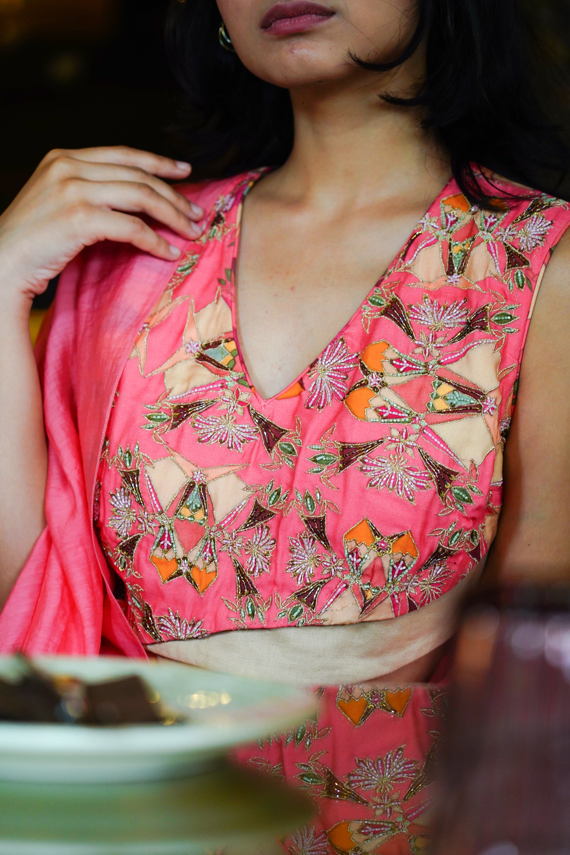 The Top (Blouse/Crop Top): A fitted, sleeveless crop top in a vibrant coral or peach hue. The bodice is richly decorated with detailed threadwork embroidery in complementary colors, creating a textured, festive finish. It features a modern V-neckline.
