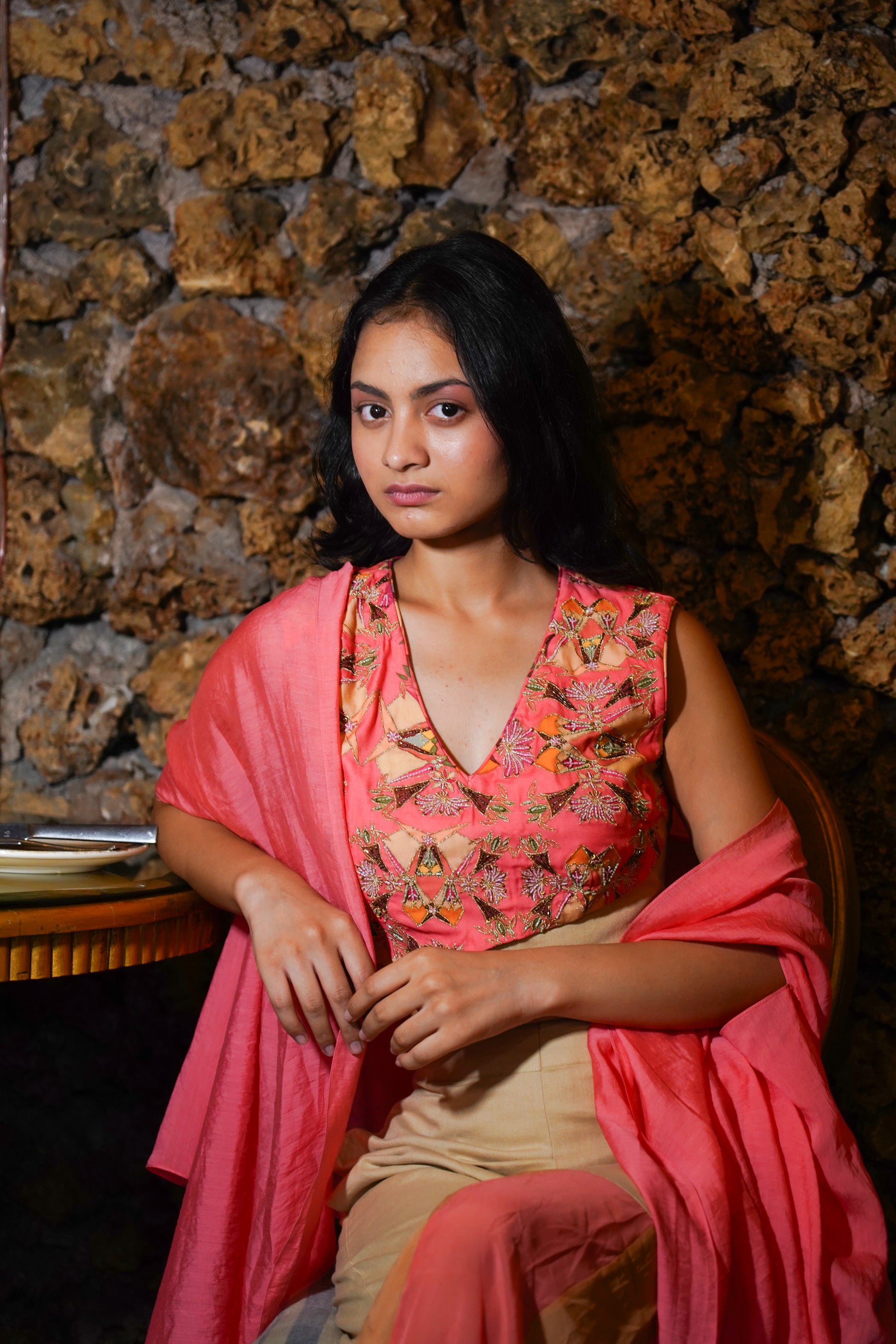 The Cape (Shrug/Jacket): A lightweight, open-front draped cape in matching coral fabric. This element adds a layer of sophistication, movement, and coverage, completing the stylish, flowy silhouette.