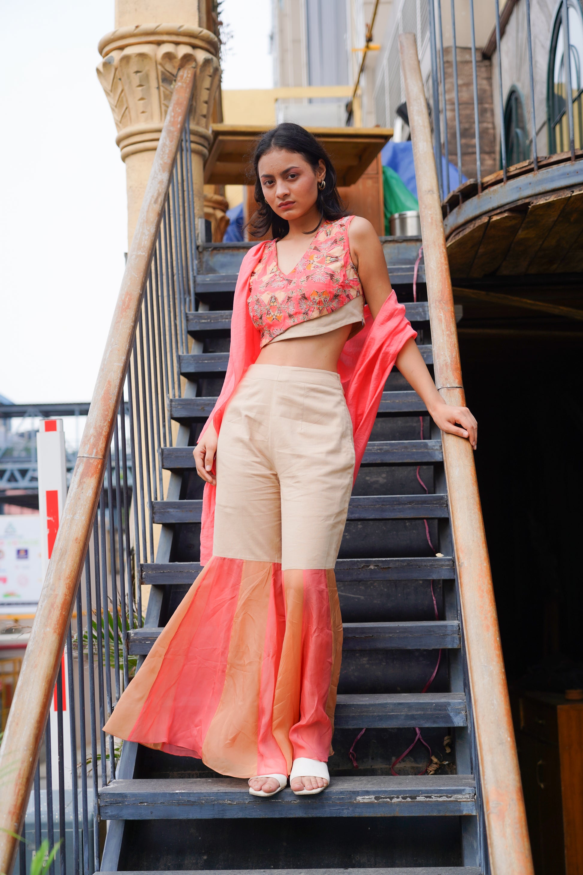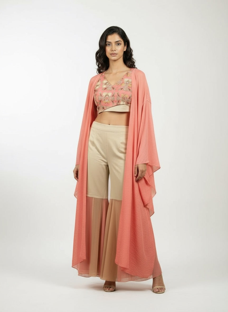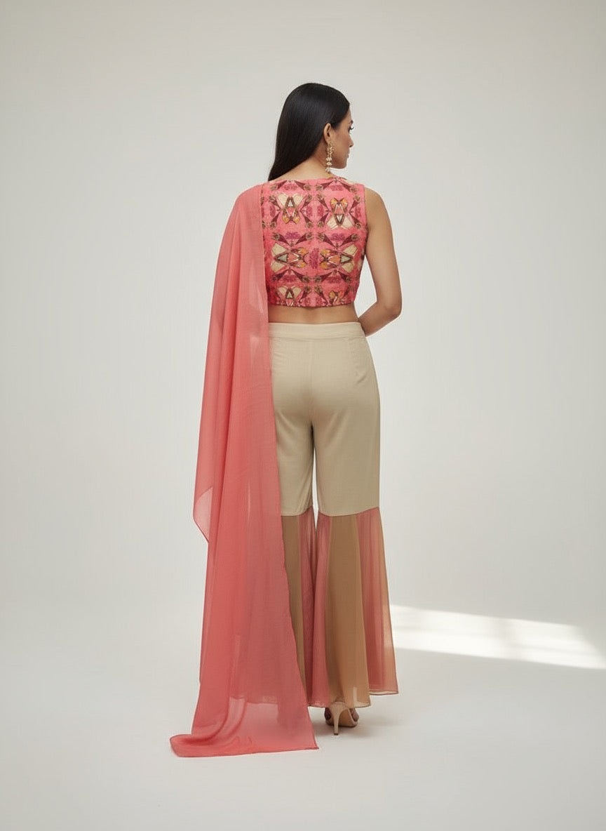 The Trousers (Pants): High-waisted, tailored beige/sand trousers that combine comfort with flair. The lower part of the leg is color-blocked with panels of flowing coral fabric, creating an elegant, dramatic flare or gharara effect towards the hemline.